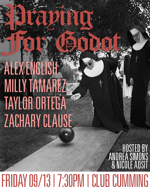 Praying For Godot Friday, September 13, 2019 7:30 PM 9:30 PM 19:30 21:30 Club Cumming 505 E 6th Street New york City, NY (map) Google Calendar ICS 7:30 PMHosted by: Andrea Simons & Nicole AdsitFeaturing: Alex English, Milly Tamarez, Taylor Ortega, Zachary Clause
