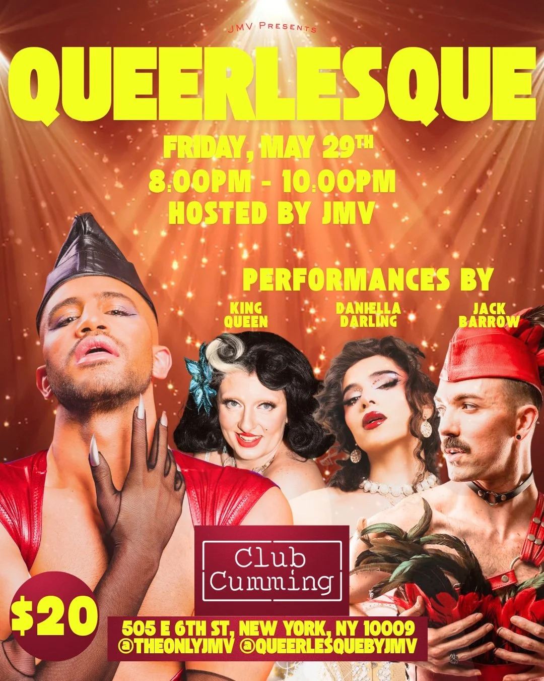 JMV Presents: Queerlesque, an all-queer, very entertaining show with spectacular performers putting on clothes to take them back off for you… oh, & for themselves. Each entertainer has their very own eccentric style that will leave you wondering why you’re still clothed. Get ready for QUEERLESQUE.