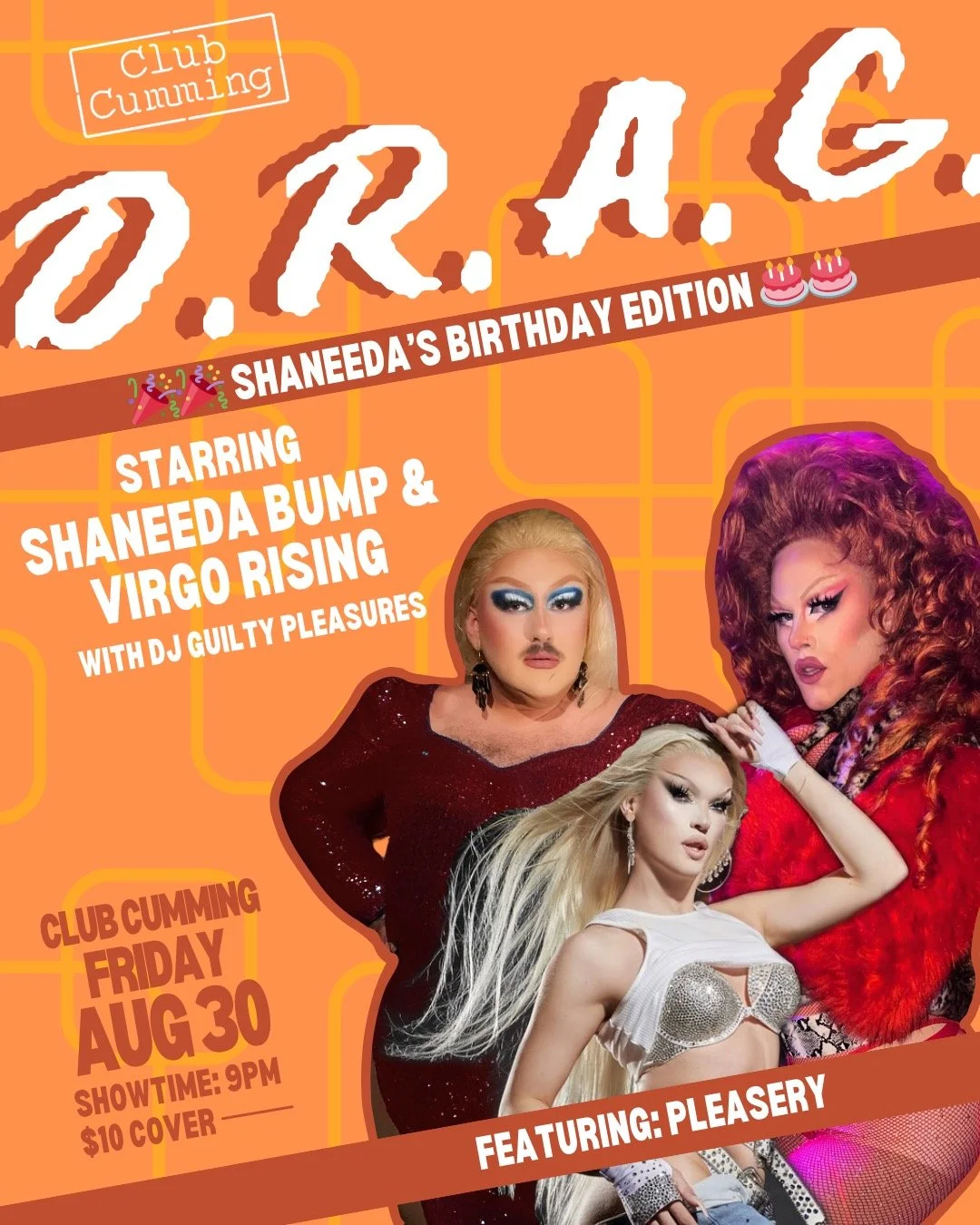 Shaneeda Bump & Virgo Rising are bringing back D.R.A.G., the debauchery, ridiculousness, & amusement get-down, to Club Cumming! Come enjoy a night filled with laughter, libations, and lots of lunacy, as these queens take you through an evening of drag performances, games, and more! This time with special guest Pleasury
